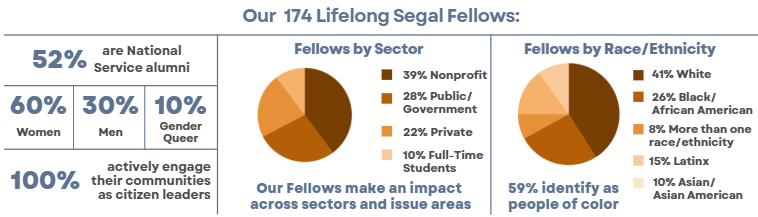 Accessibility description: Charts showing 52 percent of Fellows as national service alumni, 60 percent are women, 30 percent are men and 10 percent as genderqueer or non-binary. Two pie charts detail a majority of Fellows both serve in the nonprofit sector, and a majority of Fellows identify as people of color.